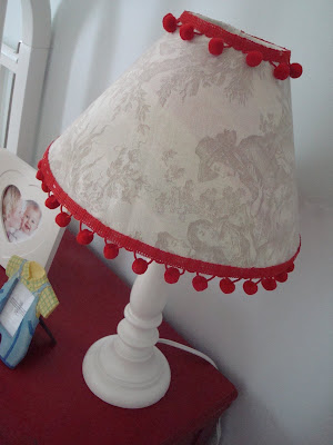 - And last but not least, a mistreated lamp. I glued some of the same toile fabric on the shade plus more red pom-pom trim. Cute. (In case you’re wondering, I am not the Norwegian model you see in the frame, kissing my darling baby. I just have yet to print any photos of my now-one-year-old-baby.)