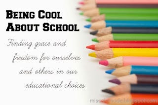 When I began the Being Cool About School series earlier this month, I had no idea what to expect. But you received it. You really did. Apparently a lot of us are looking for grace and freedom for ourselves and for others in our educational choices. My hope is that the series will continue to promote grace-filled dialogue and serve as a resource for others who need some ponderings and perspective on the issue of school. All 10 posts are over there in the right sidebar. Just click on the Being Cool About School button.