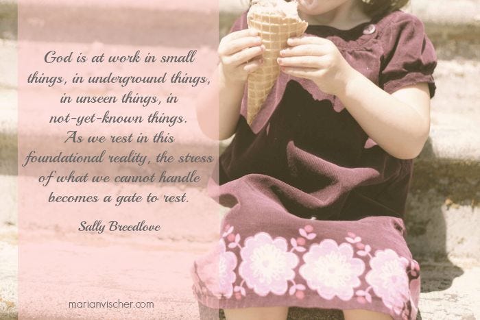 If we are going to live out of a heart at rest, we must make the fundamental faith decision that no matter how deep or urgent the need is, it is ultimately not all up to us. We must choose to believe that God is at work in small things, in underground things, in unseen things, in not-yet-known things. As we rest in this foundational reality, the stress of what we cannot handle becomes a gate to rest.