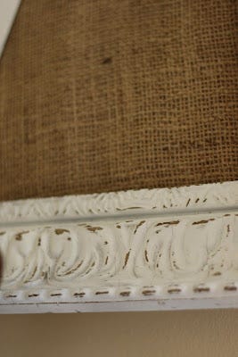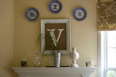 And here she is now, wrapped up in burlap and coated in white spray paint. My mantle wanted a little makeover and this fit the bill and the budget.