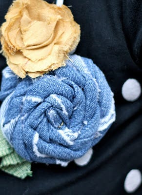 Last but not least, fabric flowers. I've lost count of how many I've made. Old sweaters and cut-off jean scraps have all fallen prey to my fabric flower obsession. The ridiculously talented Emily at Jones Design Company has several simple tutorials on making a variety of fabric flowers.