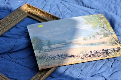 Framed monograms on fabric are another hot item all over Pinterest. I already had a big monogram just sitting in the attic. I found the frame for $2 at Goodwill. Here she is in all her faded and fake-gilded glory.