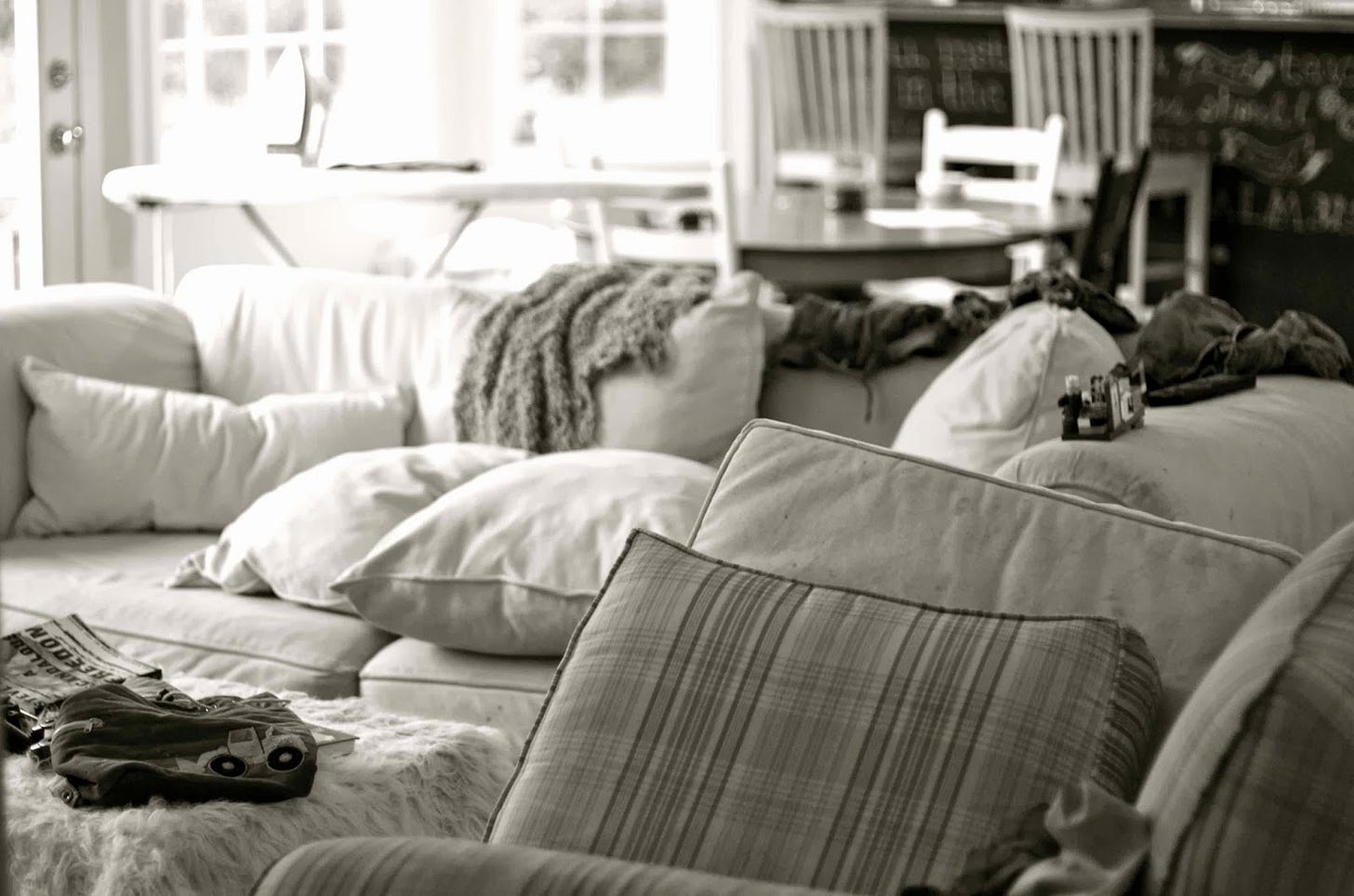I love it here because it's where we live. And man, do we live. The garage, drive, and yard remain in a perpetual state of disarray, thanks to little boys who build rockets out of junk and neighborhood kids who have scooted and biked and hot-wheeled and sidewalk-chalked thousands of laps around our driveway. We've scuffed all the walls, stained all the furniture, and moved things around into every possible configuration, trying to maximize space and make this little house work even harder than it already does.