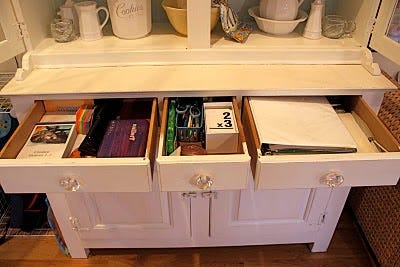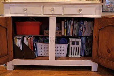 My rehabbed hutch does double-duty for our homeschool and craft supplies.