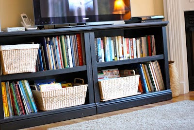 I look forward to reclaiming them as such once we get something from IKEA for the TV. But until then, these bookcases / former nightstands {from Wal-Mart} do the job just fine.