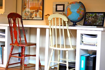 This is our homeschool desk. I've written about it before and though it's purpose is school, it's also my laundry-folding table and craft table. When we've had guests, we just pulled the tables away from the wall and voila, an extra place to eat or a buffet. It's totally multi-purpose.