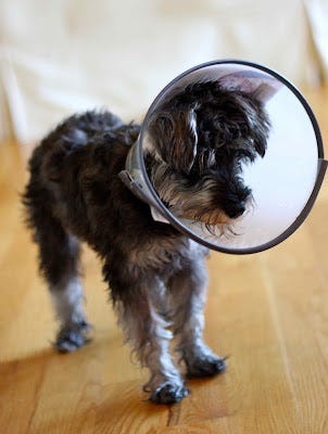 After a groggy and whiny evening, she is hobbling along a bit better today but hating the "cone of shame." She keeps bumping into the furniture and walls and oh, it is going to be a long 10 days. I remind myself that all of this is nothing compared to the ordeal of her getting knocked up by a neighborhood dog, having an emergency c-section, and costing us thousands.
