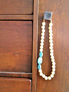 The beads are wooden and it has 3 chunky turquoise stones. It's fun and lightweight and feels like spring.
