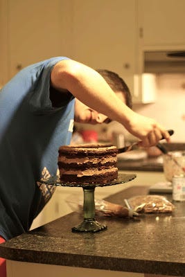 Technically, we're all hanging out together because it's March Madness and we're kind of a basketball-loving family. But my brother, the one who's the baker, has renamed it March Fatness. His dessert list for the weekend: Cream Cheese Coffeecake, Golden "Eggs," Boston Cream Pie Cake, Candy Bar Cookies, Bale Bars, Banana Pudding, and the Helga Cake.