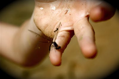 Later she rescued this baby dragonfly from certain death-by-arachnid, carefully untangling it from a web on the dock and tearfully exclaiming: