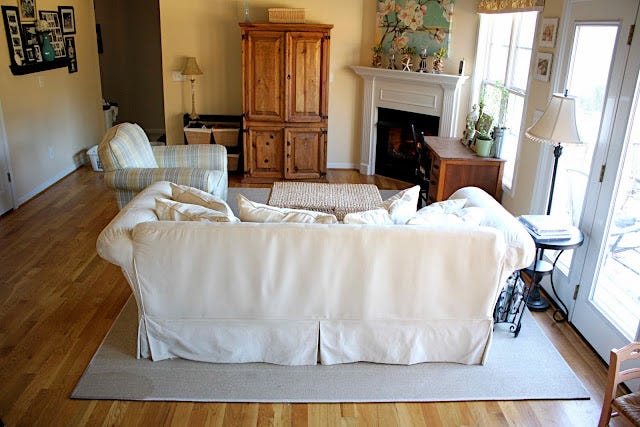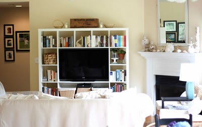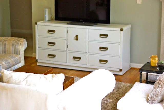 Fresh color on the walls ushered in some other fresh updates. My favorite is a "new" piece of furniture for our TV.We've lived in this house 7 1/2 years and the TV wall has gone from this (Pier One pine armoire):