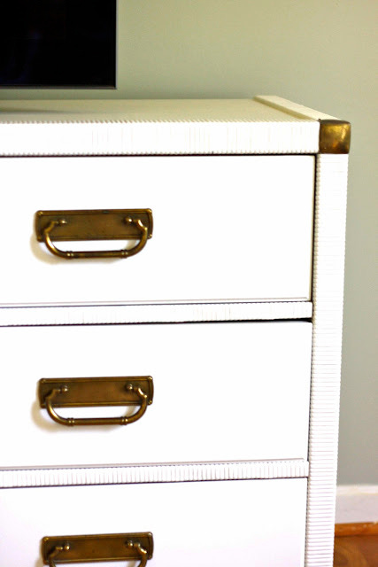 White may be "boring" and what I always end up painting my stuff but maybe that's because it's fresh and looks good with everything. Plus, the bronzey bling on the drawers and corners makes her glam instead of "meh."