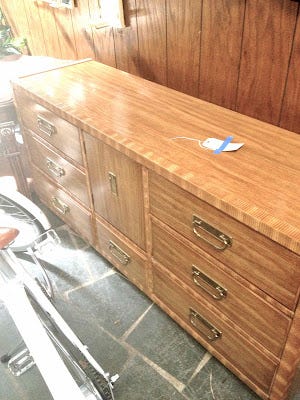 Finally I moved the solid but bubbled dresser to my boys' closet {as they were in desperate need of some storage} because at long last I found the perfect piece at a local consignment store.Love at first sight. {She looked less orange in real life.} Here she is in the store: