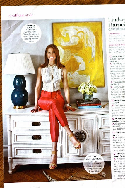 How about that? The wall color is almost the same as mine and the style of that dresser is eerily similar as well. I have a shiny turquoise lamp in my living room and my favorite accent color is that bright yellow. It was fun to see that this piece I'd been waiting for was meant to be, a true fit for my style, form and function. Sometimes it's reassuring to know that what you picked is actually what you like. Now, if only I had the talent and motivation to hack that gorgeous painting.