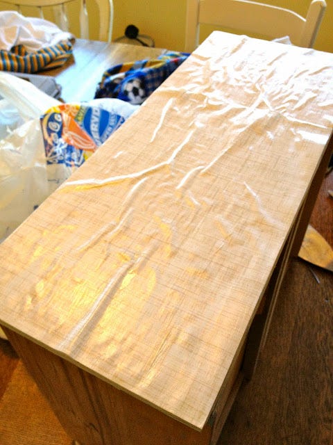 A friend of mine gave me an old dresser that I repainted but despite ridiculous amounts of sanding, I couldn't get some of the bubbled wood sanded flat. I experimented with a number of failed drawer coverings. Burlap, painted burlap, modge-podged patterned papers....all of them epic DIY fails.{Exhibit A: #modgepodgeisthedevil}