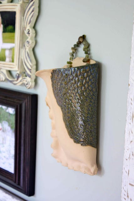 Another is a gorgeous Anthropologie teapot gifted to me by Lily for my birthday a few years ago. The last is a hanging piece of pottery crafted by a local South Carolina artisan and given to me by my dear sister last year.