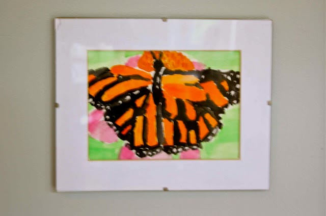 6. Crop. This is something I've just discovered. My daughter has gobs of art and because she's a perfectionist, she hates most of it. Thankfully, I have salvaged some precious pieces from the trash. This monarch butterfly, one of her "earlier works," was painted on a much larger piece of paper. I cut out just the butterfly and framed it. Made all the difference.