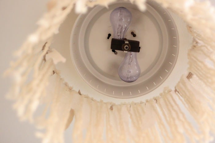 5. Attach the fixture to the ceiling with little hooks that you hang coffee mugs on. {I don’t know the real name of them but they screw into the ceiling.} I only needed two. Lightweight metal frames dangling with yarn don’t weigh very much so this shouldn’t fall from your ceiling. If it does I am not responsible.
