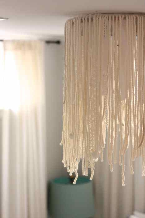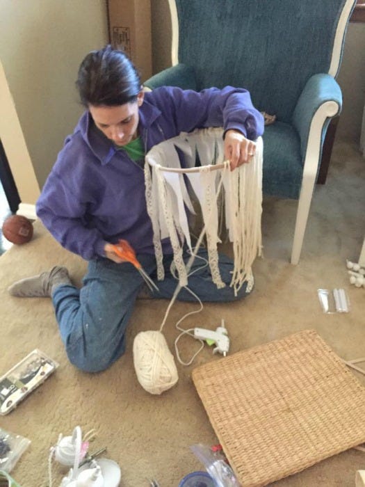 You won’t find this fixture in a magazine. It looks more crafty than couture. I hope to add more yarn and beads to make it a bit more substantial. But it worked. Resourcefulness and perseverance WON. And even though she would have picked a tiered chandelier from PB Teen in a perfect world, she actually said she wouldn’t change her one-of-a-kind chandy, pieced together with love. And a lamp shade from a stranger’s curb. And a lot of anger and unbalanced hormones if I’m being honest.