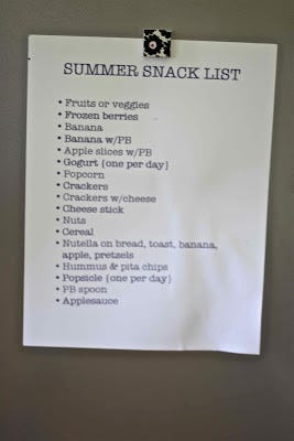 Instead of feeling like the Snack Nazi, I just refer hungry kids to the pantry door and let the list do the bossing for me. Just one more way I'm working hard to do the bare minimum this summer.