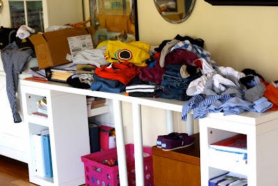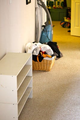Stacks of folded laundry have been patiently waiting to be put away but the boys' closet is so full of wadded-up clothes that putting the laundry in the drawers means first clearing a path through a mountain of dirty clothes and super-hero costumes.