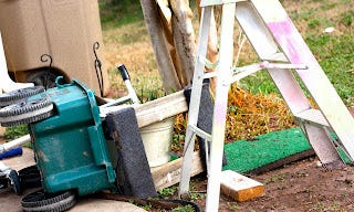 The driveway and side yard have been littered for four days with junk from the garage that my littlest guy configured into a bakery.