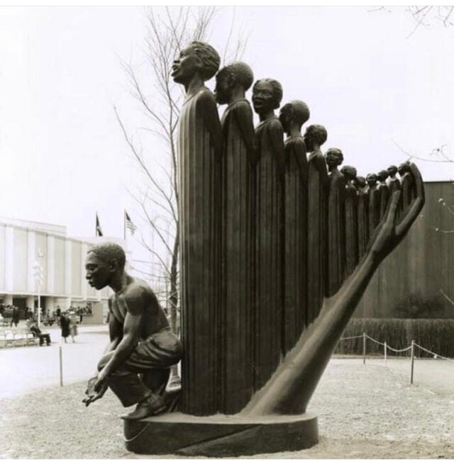 Image: “The Harp” by sculptor Augustus Savage. This piece was was inspired by James Weldon Johnson’s song, “Lift Ev’ry Voice and Sing” and depicts 12 African Americans singing, held by the hand of God. It was commissioned for the 1939 World’s Fair. Due to lack of funds and storage after the fair closed, all of the art pieces were destroyed, including The Harp. 😭 Thanks to my friend, Dr. Keri Manning, for teaching me about this piece in her Facebook series last year on Black art.