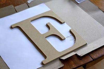 First, go get your letters and scrapbook paper. Hobby Lobby has thick chunky cardboard ones that are about 8 inches high, thinner mdf letters that are probably 10-12 inches high {which is what I chose} or giant chunky cardboard ones. Those were my favorite but they were too big for my space. By the way, the letters are 30% off this week and the paper is 50% off.