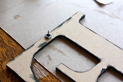 There are probably better ways to hang one's letters but I whipped out the top two favorite craft supplies in my limited arsenal: upholstery tacks and hot glue. It made the process of hanging them evenly super easy.