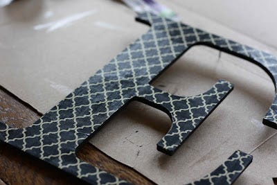 The next part was trial and error for me. I found that my paper tended to bubble and not stick, so I used a light coat of spray adhesive, stuck the paper on the letters, and then modge-podged over the top.